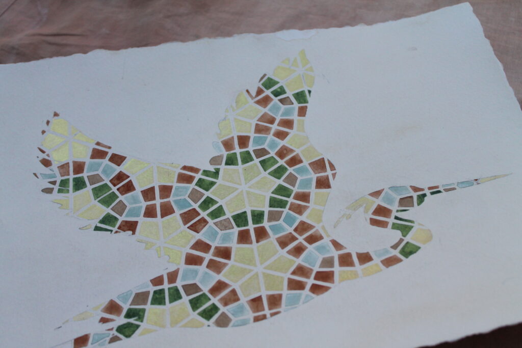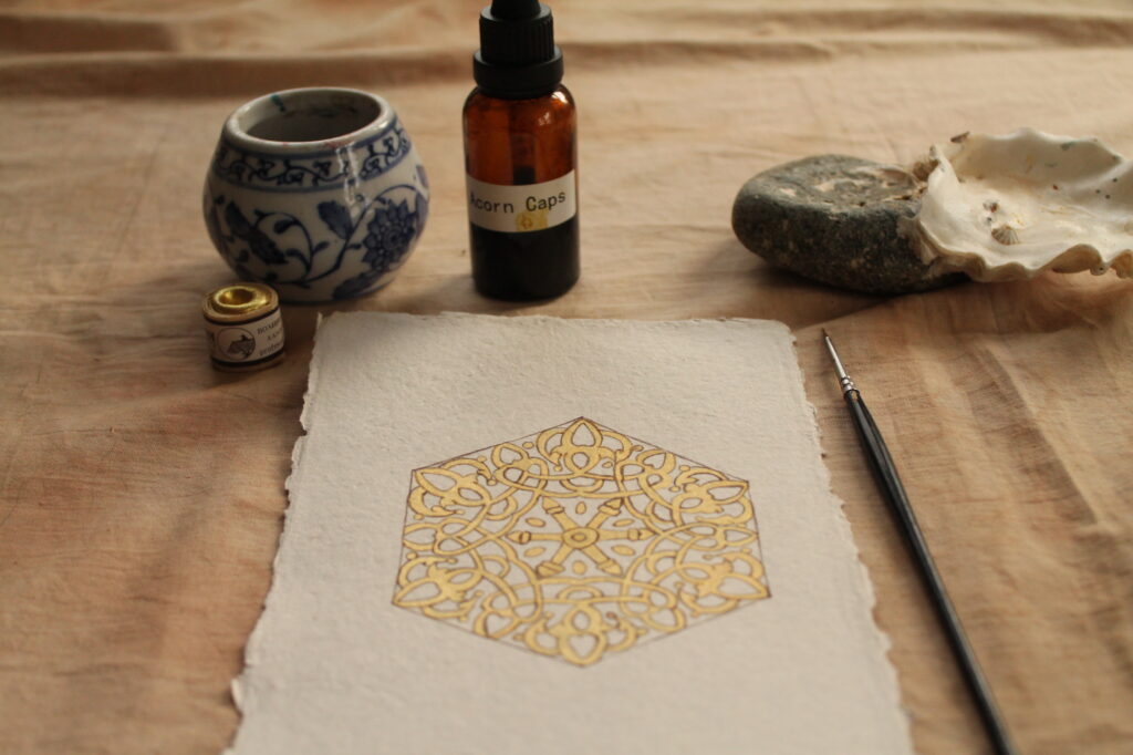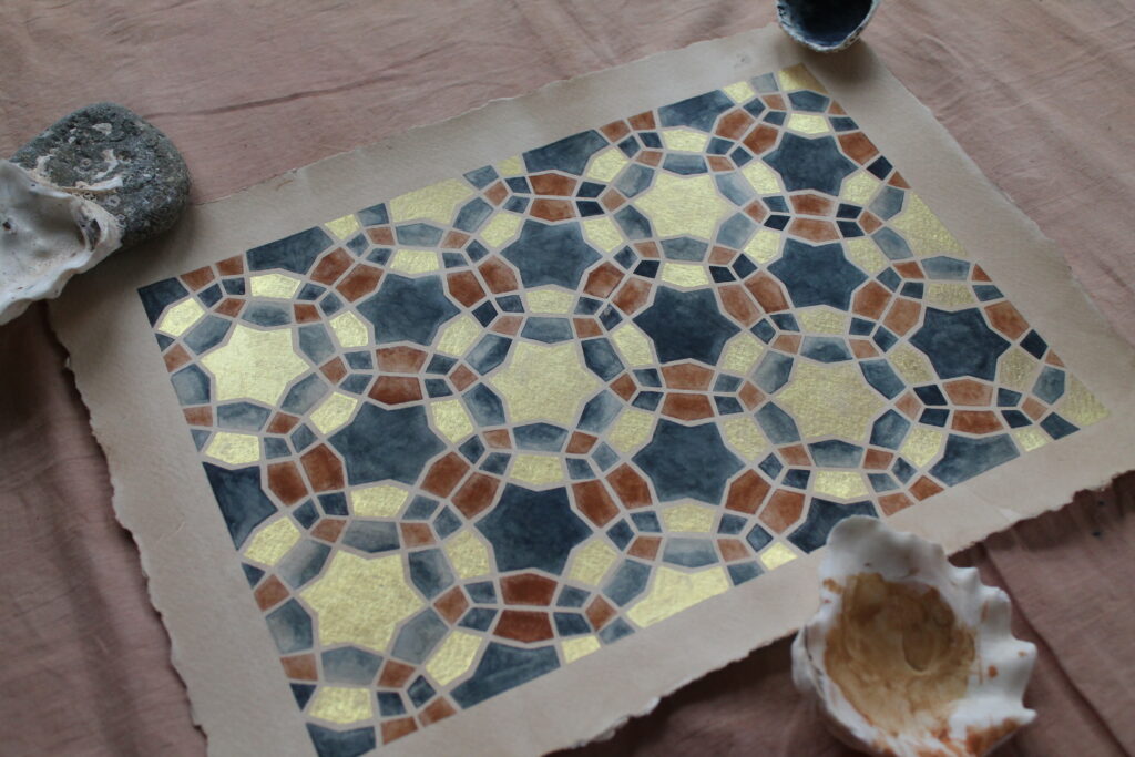 Biomorphia is a visual exploration of land, cycles, repetition, and motifs through traditional Islamic geometry and biomorphic art. Each design is carefully constructed by hand using a pencil, ruler, and compass based on patterns from monuments across the Islamic world, using methods taught by artists Esra Hamal and Samira Mian. Drawings are then tessellated to repeat the pattern. Designs have been painted using earth pigments and natural inks created by the artist and mica-based gold. The focus on a slow, repetitive, and laborious practice is a way to resist the urgency and overwhelming nature of production and consumption today. Inspired by the writings of Bayo Akomalafe about slowing down in urgent times as a way to heal the rift created by a commodified world, the artist uses simple materials and tools (rocks, plants, mortar, pestle, compass, handmade paper) to create intricacy and complexity. The artist morphs materials into visual poetry, while the patterns morph the artist’s way of thinking and being by becoming a moving meditation and contemplation.
