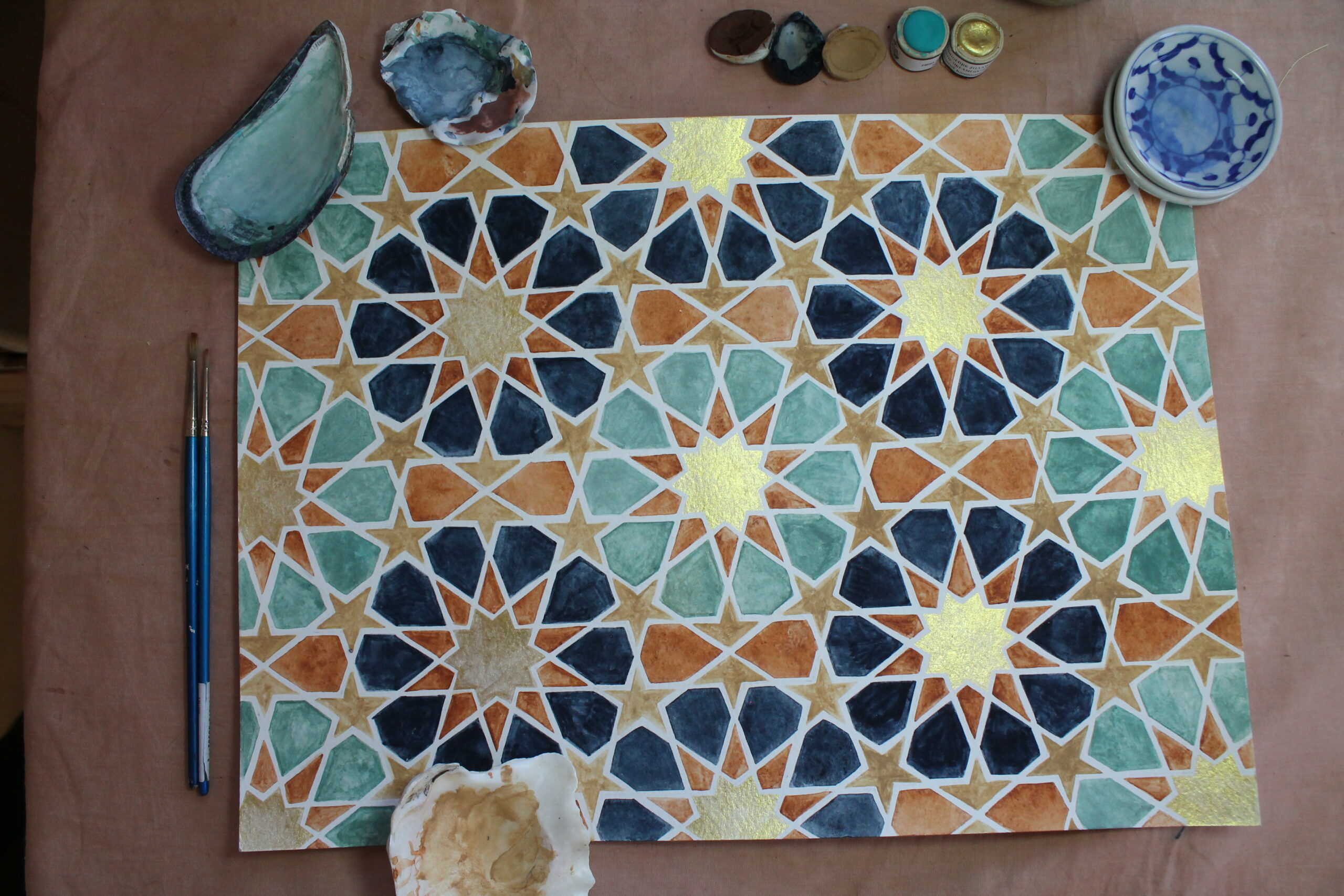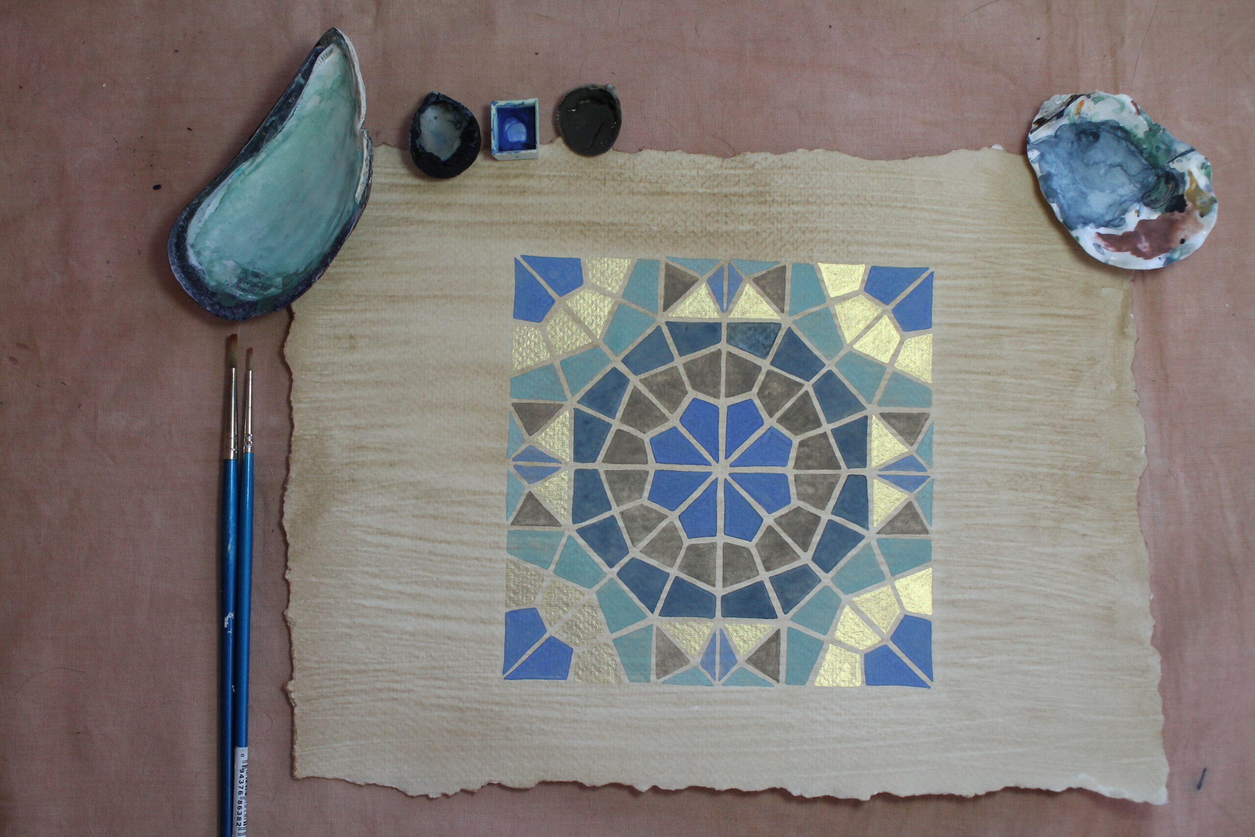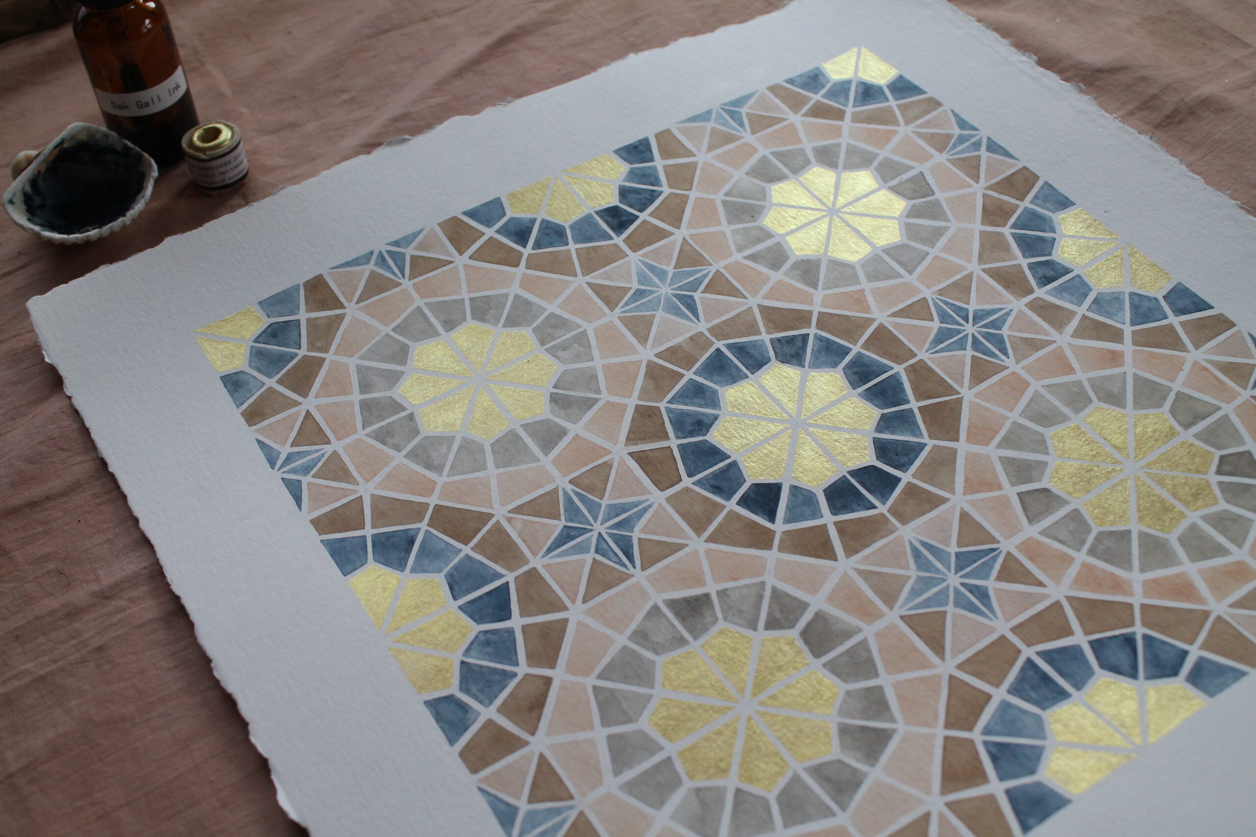 Biomorphia is a visual exploration of land, cycles, repetition, and motifs through traditional Islamic geometry and biomorphic art. Each design is carefully constructed by hand using a pencil, ruler, and compass based on patterns from monuments across the Islamic world, using methods taught by artists Esra Hamal and Samira Mian. Drawings are then tessellated to repeat the pattern. Designs have been painted using earth pigments and natural inks created by the artist and mica-based gold. The focus on a slow, repetitive, and laborious practice is a way to resist the urgency and overwhelming nature of production and consumption today. Inspired by the writings of Bayo Akomalafe about slowing down in urgent times as a way to heal the rift created by a commodified world, the artist uses simple materials and tools (rocks, plants, mortar, pestle, compass, handmade paper) to create intricacy and complexity. The artist morphs materials into visual poetry, while the patterns morph the artist’s way of thinking and being by becoming a moving meditation and contemplation.