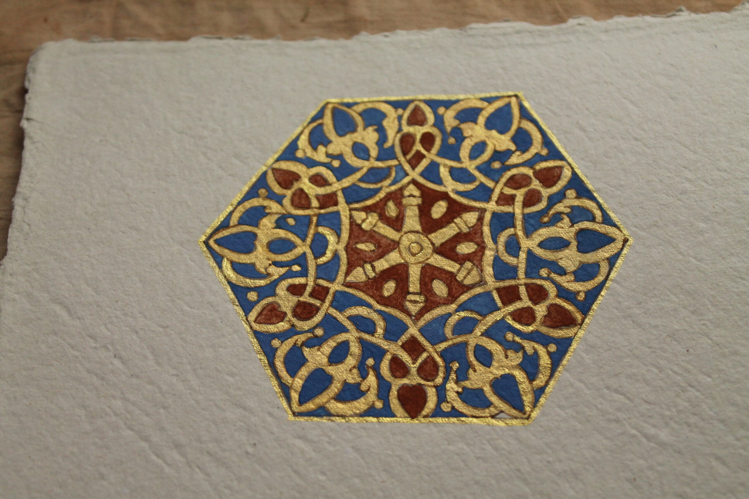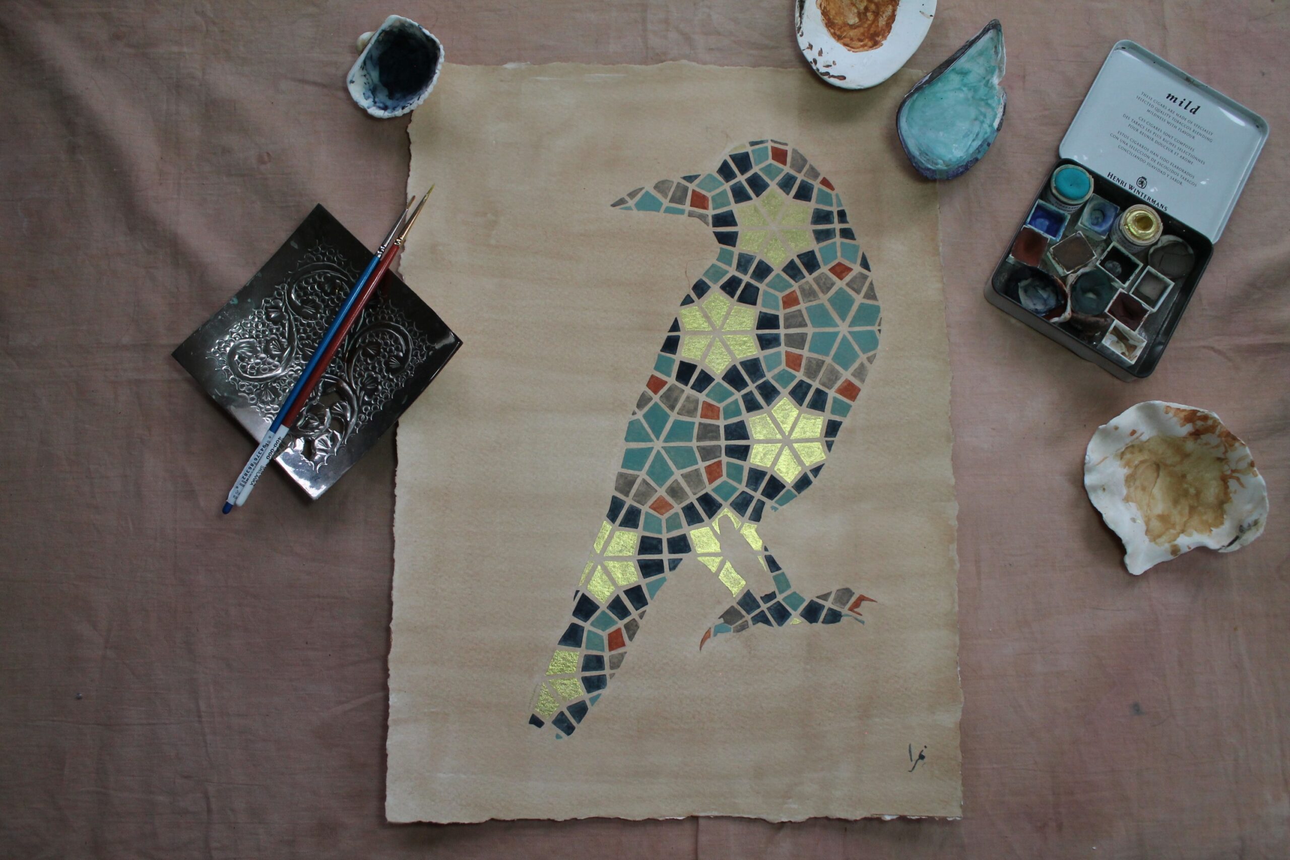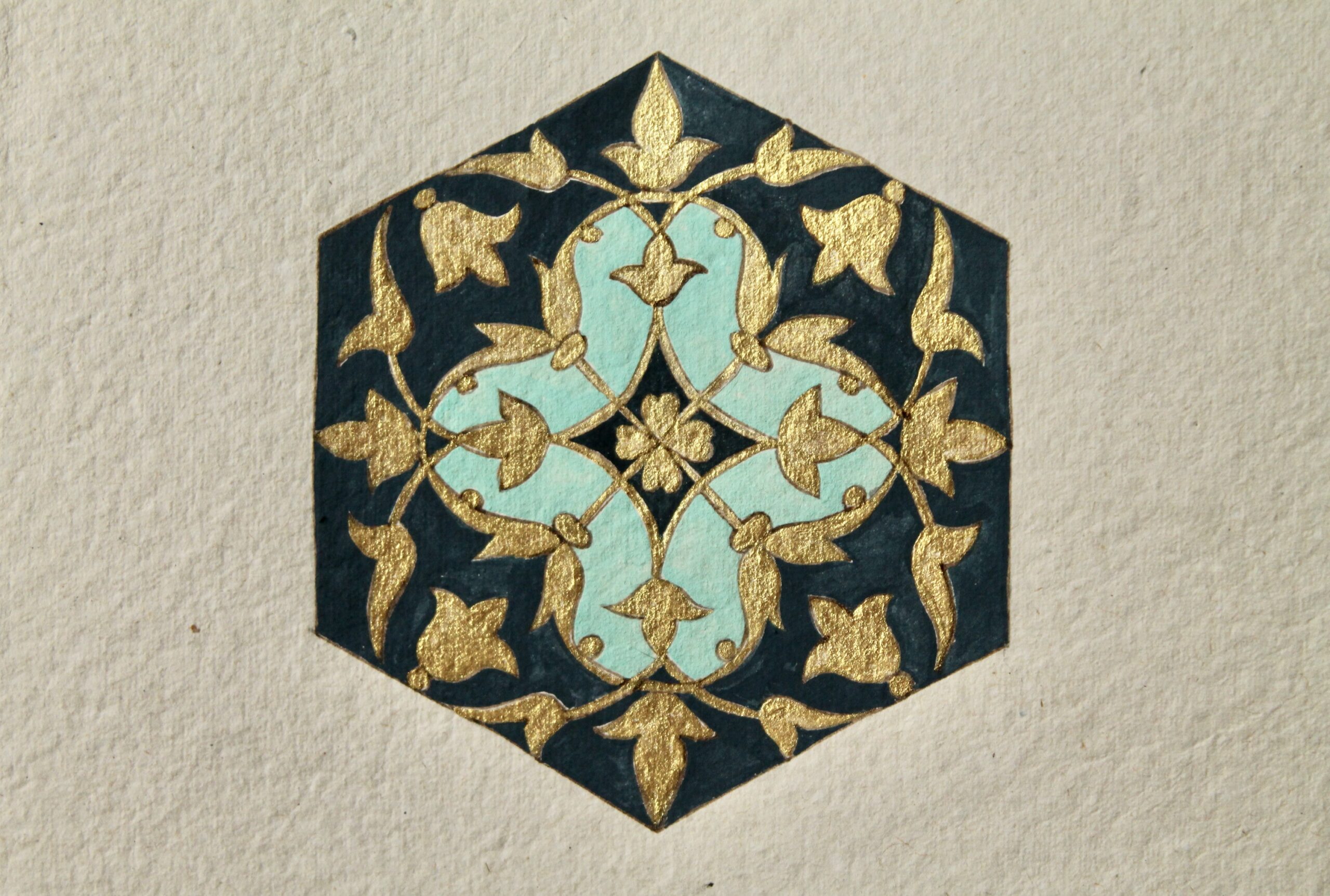 Biomorphia is a visual exploration of land, cycles, repetition, and motifs through traditional Islamic geometry and biomorphic art. Each design is carefully constructed by hand using a pencil, ruler, and compass based on patterns from monuments across the Islamic world, using methods taught by artists Esra Hamal and Samira Mian. Drawings are then tessellated to repeat the pattern. Designs have been painted using earth pigments and natural inks created by the artist and mica-based gold. The focus on a slow, repetitive, and laborious practice is a way to resist the urgency and overwhelming nature of production and consumption today. Inspired by the writings of Bayo Akomalafe about slowing down in urgent times as a way to heal the rift created by a commodified world, the artist uses simple materials and tools (rocks, plants, mortar, pestle, compass, handmade paper) to create intricacy and complexity. The artist morphs materials into visual poetry, while the patterns morph the artist’s way of thinking and being by becoming a moving meditation and contemplation.