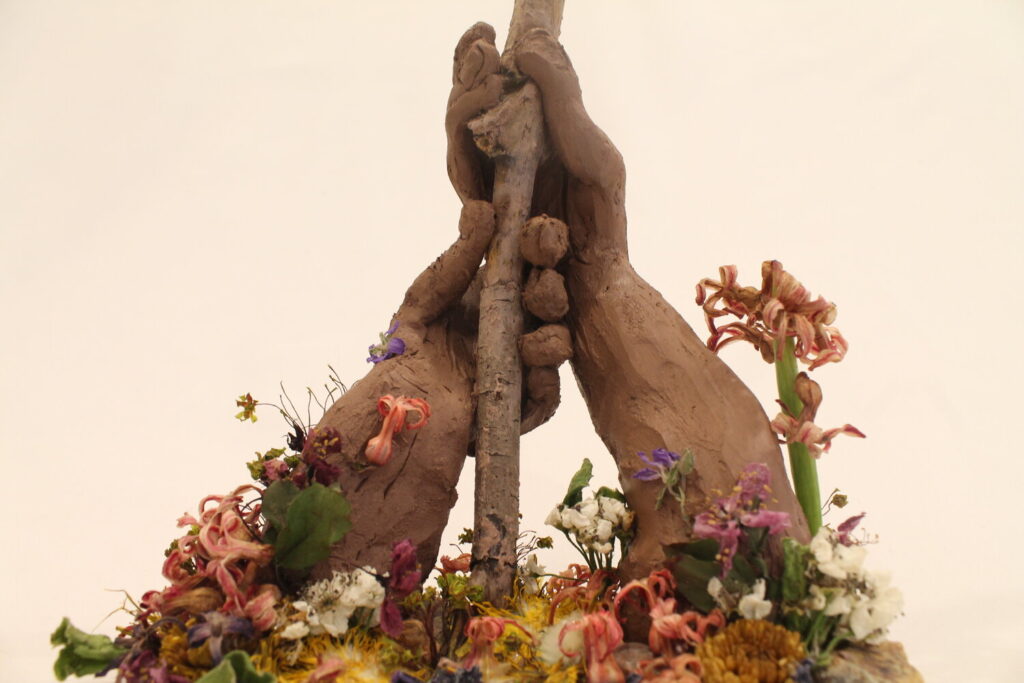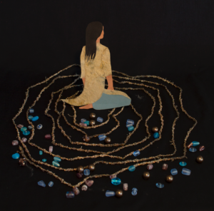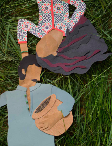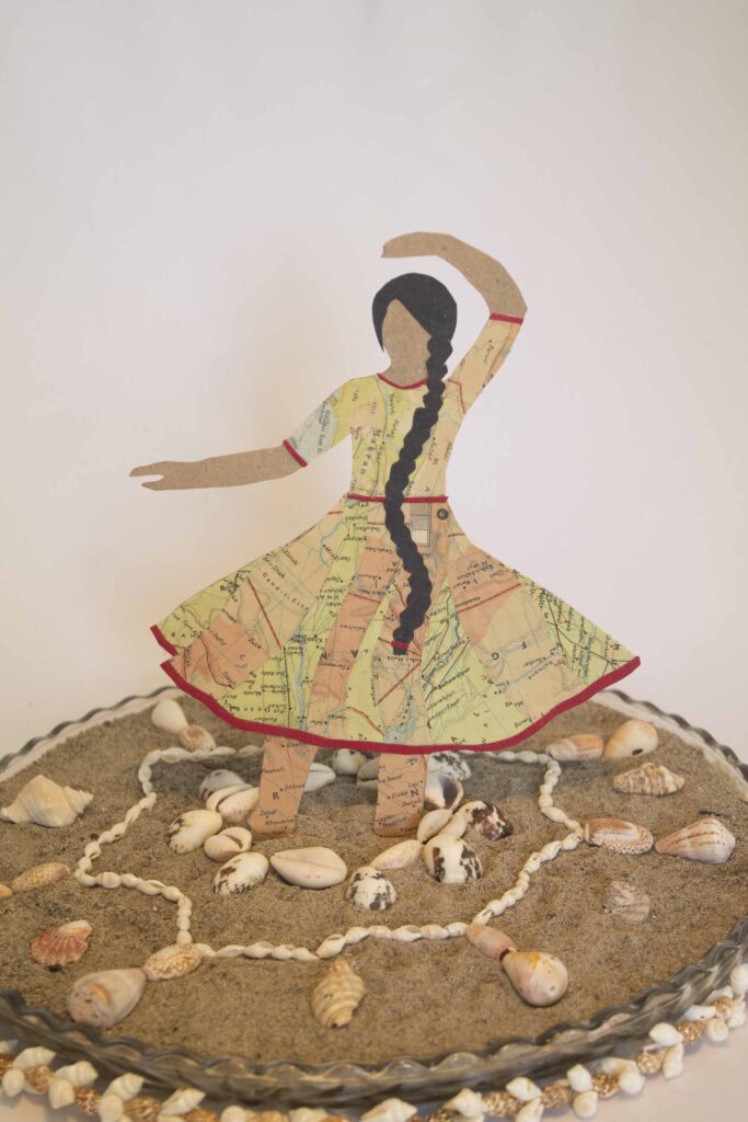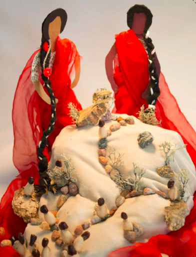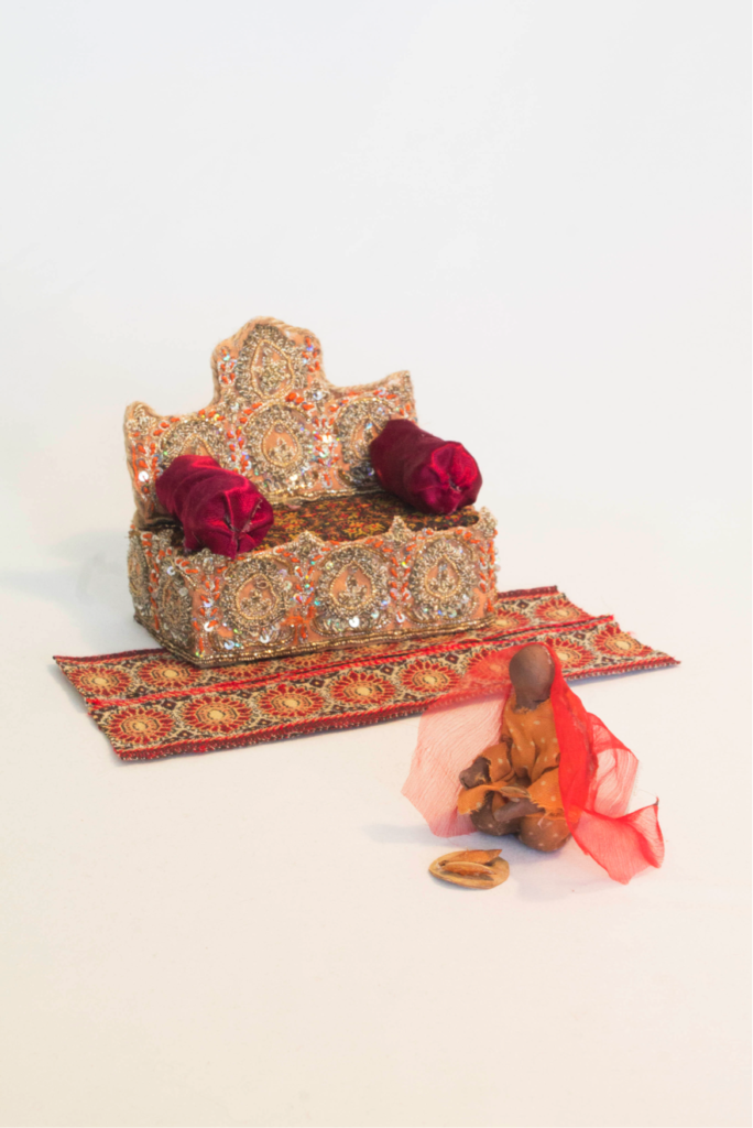 Women Wide Awake is a collection of stories, poems, and visual art exploring folklore from the region of Sindh, Pakistan. This multi-genre book features stories of women, witches, sea monsters, and mystical saints, accompanied by art and poetry. Collectively they explore themes that have resonated with people for centuries — acts of courage, strength, defiance, and love. Two sisters build a labyrinthine palace to test their suitors…a woman swims across a treacherous river at night to meet her forbidden lover…a bartendress makes a grave mistake. These folktales have persisted across generations and national boundaries through ritual storytelling and song. The sculptures were created using reclaimed materials: sari fabric, wedding invitations, flowers, shells, and animal bones.