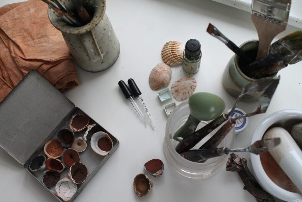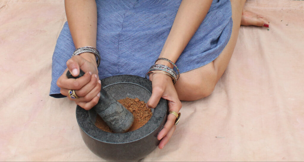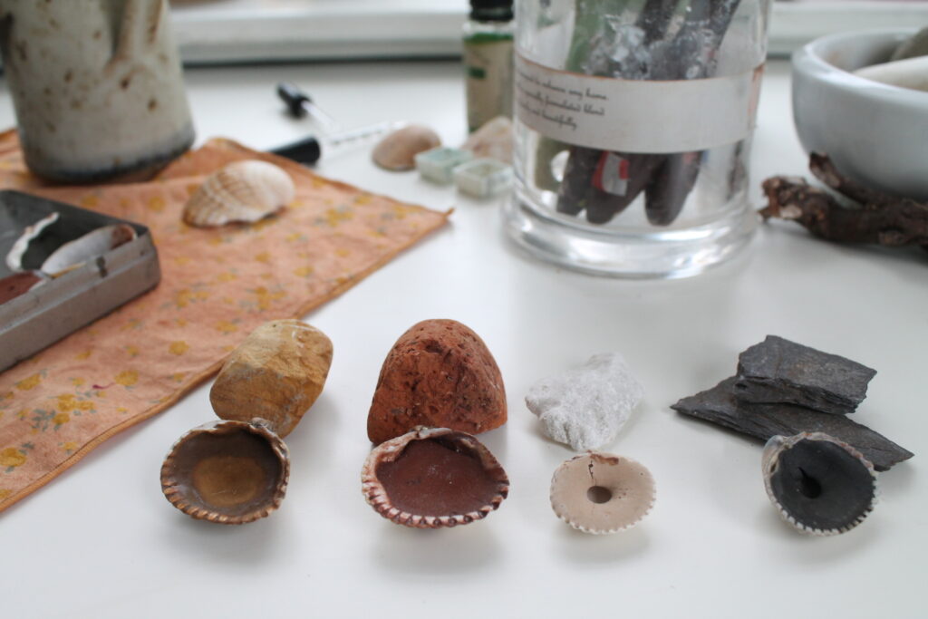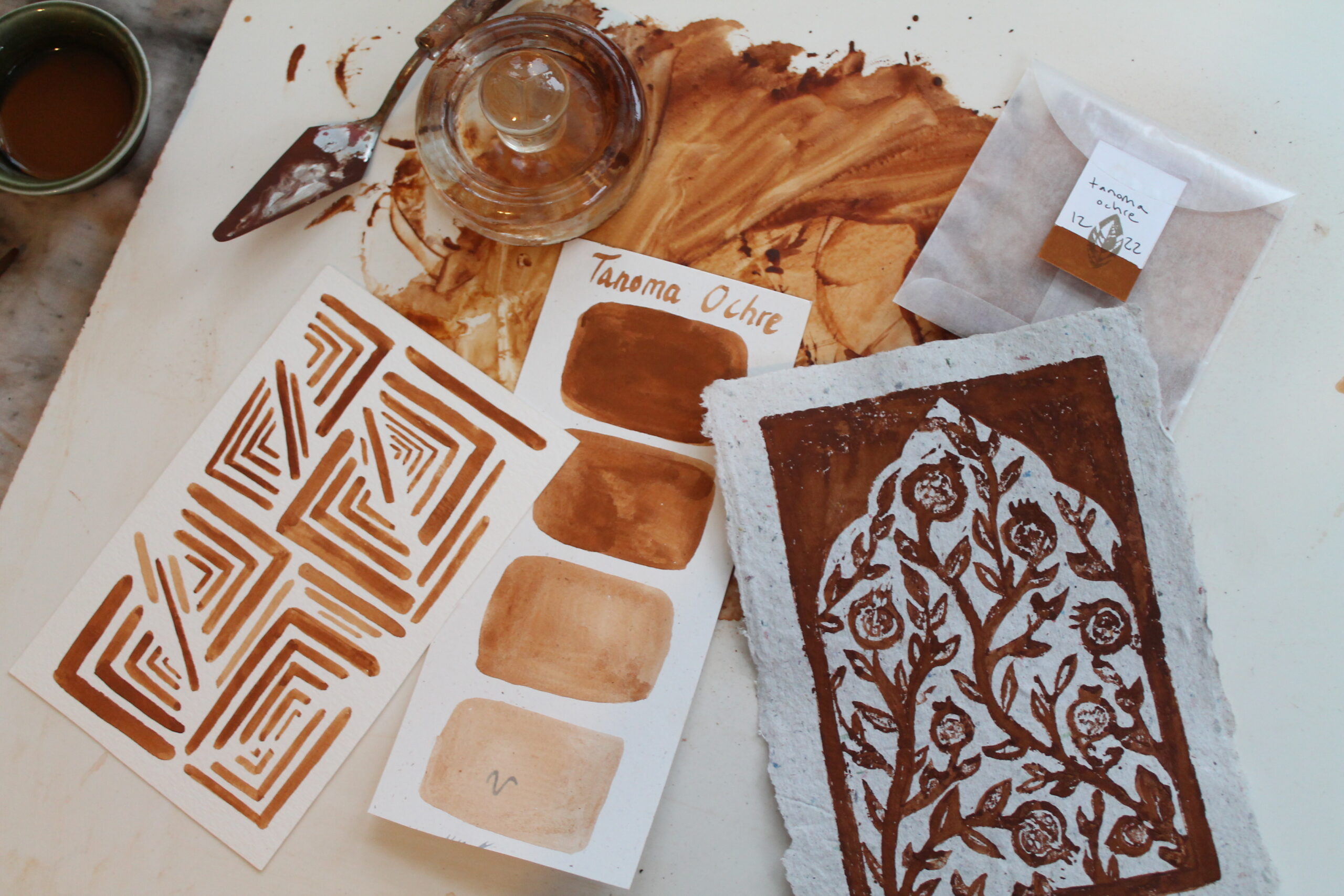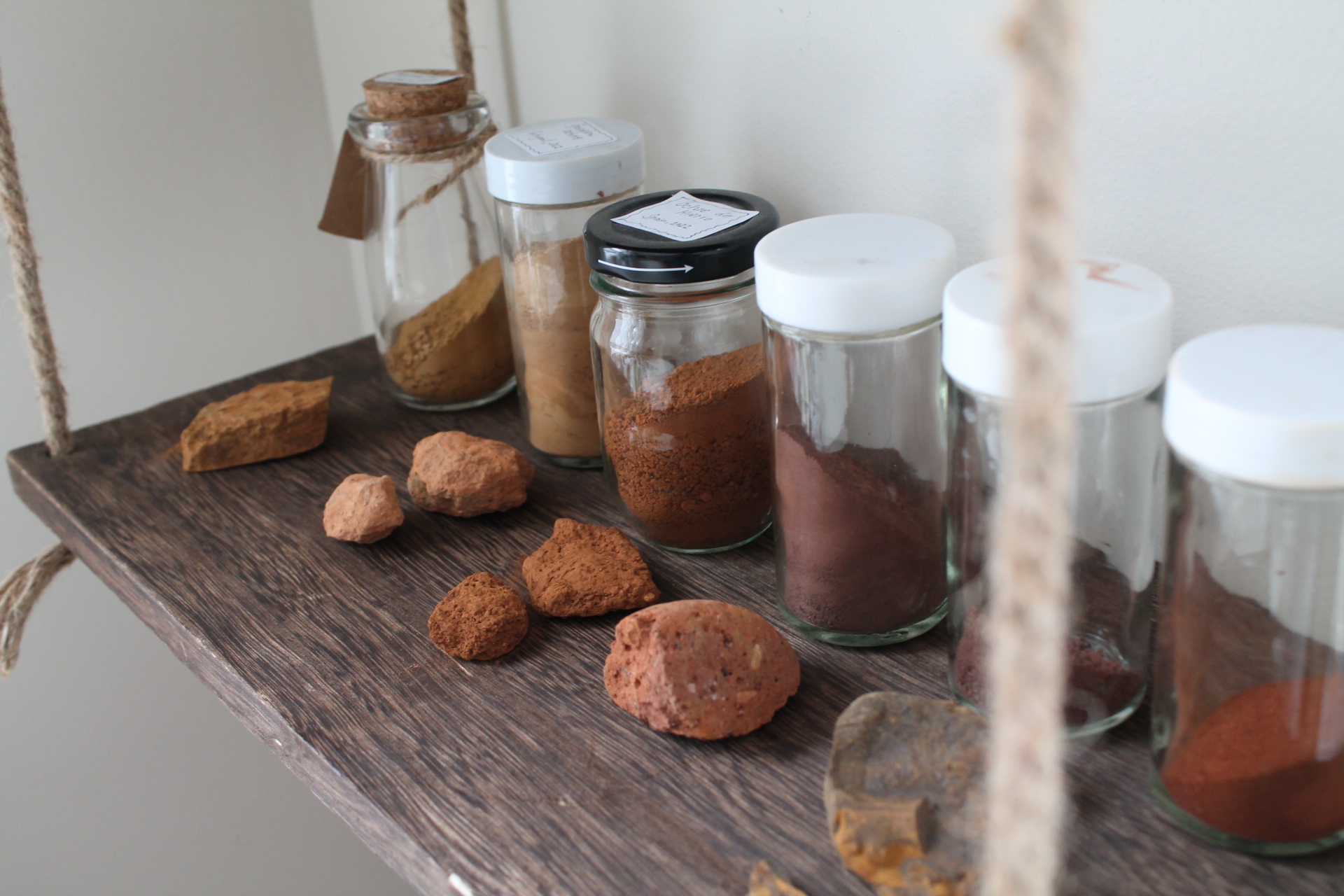 Studio Tour Processing rocks and clay into earth pigmentsProcessing rocks and clay into earth pigments Basket-making with willow bark and dandelion stemsBasket-making with willow bark and dandelion stems Harvesting wildflowersHarvesting wildflowers Growing coreopsis in the dye gardenGrowing coreopsis in the dye garden Ecoprint experiments using smokebush, sumac, and raspberry leavesEcoprint experiments using smokebush, sumac, and raspberry leaves